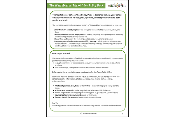 A practical pack to help schools clearly communicate their eco policy to pupils and staff. The PDF guide explains how to set up and share your school’s systems for recycling, reducing waste, saving energy, and using water responsibly. The editable PowerPoint template allows you to customise the messaging with your own photos, bin locations, routines, Eco Team roles and school-wide pledges. Ideal for assemblies, staff briefings, Eco Team work and embedding sustainability into everyday school life.