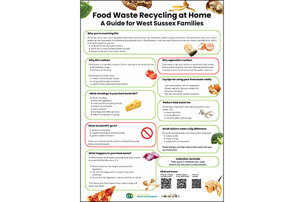This family-friendly guide supports households in understanding and correctly using the new food waste recycling system in West Sussex. Designed to complement school learning, it helps reinforce key messages by providing clear, practical guidance that pupils can share at home.