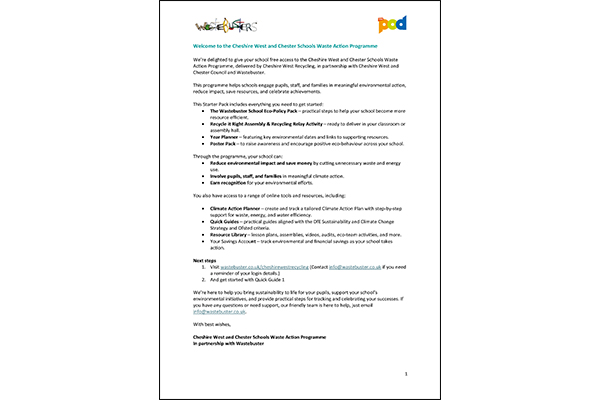 This Cheshire West and Chester pack provides a clear introduction to the Wastebuster resources and the rationale for using this across the whole school. It contains the main resources that can be used to launch the project.
