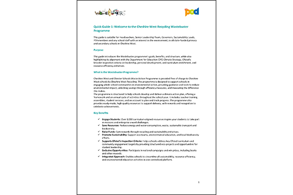 This guide provides an introduction to the Wastebuster programme and how it can support your school’s sustainability efforts. It explains how to access free resources, training, and rewards while aligning with DfE sustainability goals and Ofsted criteria. Whether starting fresh or building on existing initiatives, this guide will help you make the most of Wastebuster.